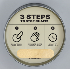 Chafe Mate is an all-natural, solid anti-chafe skin wax for athletes creates a protective layer on the skin when applied to rash-prone areas.